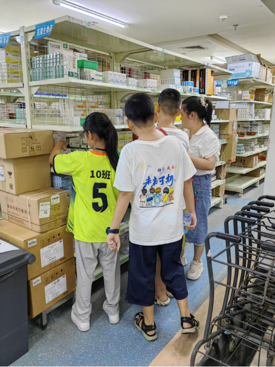 在儿童退烧药药架前,孩子们通过互动问答,辨识了甲类和乙类OTC药品,并学习了如何查看药品的批准文号。