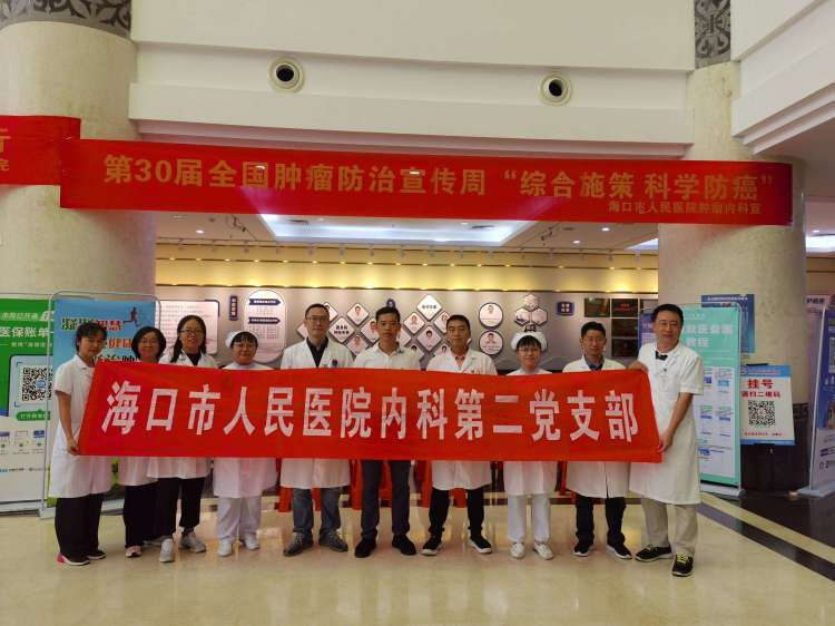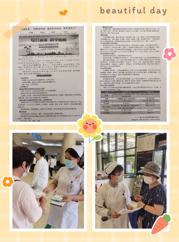 肿瘤内科联合肿瘤放疗科医护人员在李建旺主任医师的带领下,在海甸门诊一楼大厅开展联合义诊活动,通过悬挂条幅、现场当面咨询、发放科普资料等各种渠道向群众科普癌症防治知识,倡导每个人践行健康的生活方式,戒烟限酒、加强运动、调整饮食结构、接种疫苗、管理体重,控制癌症危险因素,远离癌症的发生;同时鼓励群众积极参与癌症早期筛查,选择恰当的检查检验手段,争取早发现、早诊断、早治疗,做好癌症二级预防。