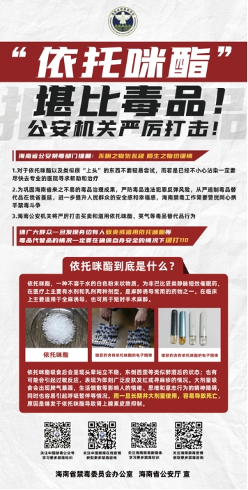 近期,社会上出现一些不法分子,利用依托咪酯的麻醉作用,将其用作毒品替代品进行销售,让人防不胜防,在此,海南公安机关提醒您: