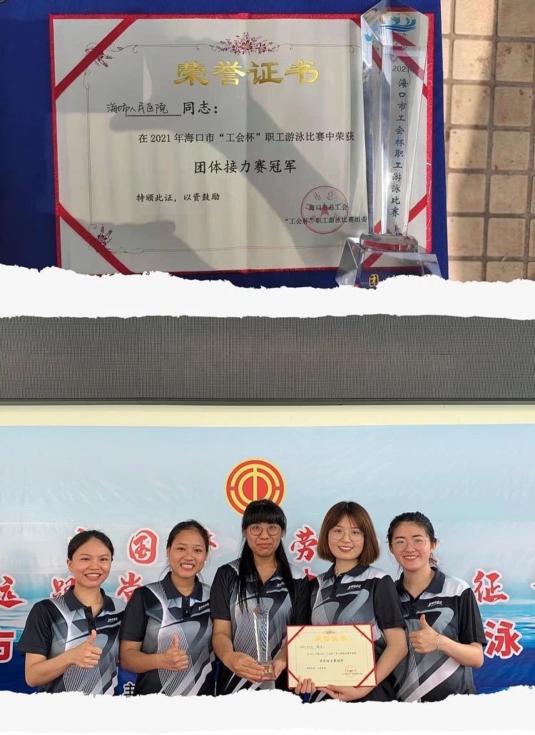 日前,我院组织15名医护人员参加了海口市总工会举办“工会杯”趣味运动会,取得了优异的成绩:获女子200米接力赛团体冠军,王诗雯分别荣获50米自由泳、50米蛙泳季军,吴玉丹荣获100米自由泳季军、梁邦耀荣获“最佳拼搏奖”。