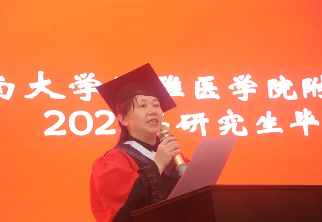 最后,张国刚教授热烈祝贺同学们顺利毕业,感谢导师们辛苦付出。他说,2021届的研究生是亲历“两个一百年”交汇的新时代研究生,承载着特殊的历史际遇和光荣的时代使命。他希望大家秉承湘雅精神,怀揣梦想,肩负责任,志于道,据于德,依于仁,专于医,站在新的历史起点上,在个人成长与国家发展的同频共振中,将更多的创新智慧、更优的创新路径、更宽的创新格局,为医院的高质量发展贡献青春力量!