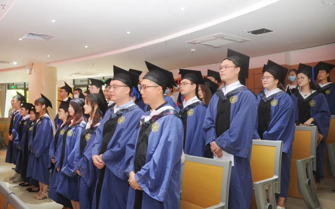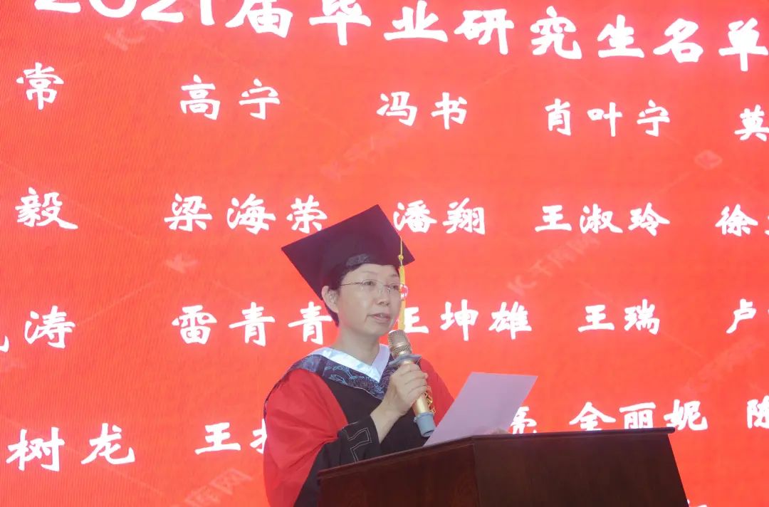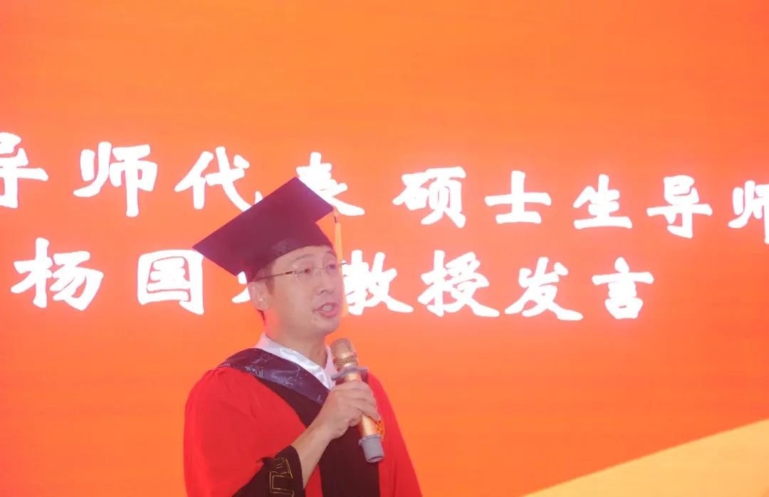 导师代表杨国帅教授发言。他说,这三年,经历了2019年新中国成立70周年、2020年的疫情防控战、2021年中国共产党成立100周年等大事件,作为一名中国人值得骄傲和自豪。他提出三点感悟与大家共勉:一是要修身立志、志存高远;二是心有仁爱,心怀感悟;三是要学无止境、业精于勤。祝愿毕业生们前程似锦。