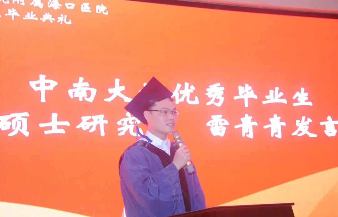 2021届中南大学优秀毕业生代表、硕士研究生雷青青发言。他感慨和回忆这三年的求学之路,有激动、有感叹、有不舍。他表示:“作为毕业生,我们要发扬‘求真求确、必邃必专’的湘雅院风,恪守‘知行合一、经世致用’的中南校训,牢记‘济世百姓、健康万家’的医院使命,用实际行动为母校、为医院争光。”