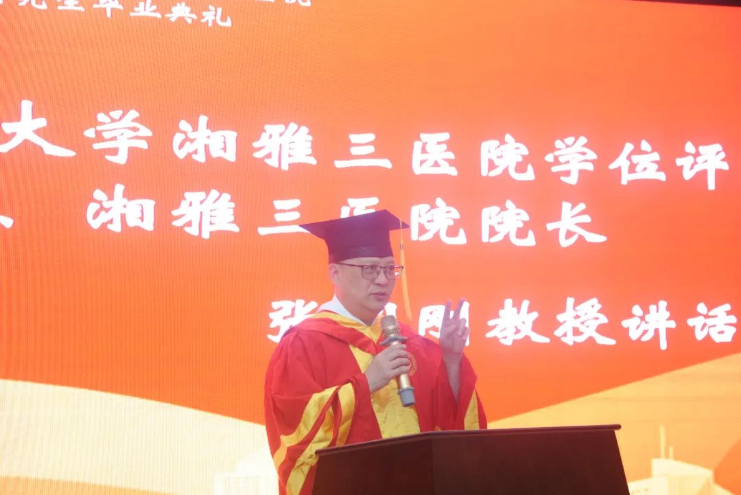 院长、博士生导师杨毅军教授致辞。他对2021届全体毕业生表示祝贺。他说,目前世界仍在遭受新冠疫情肆虐,更凸显了医学在人类生存和发展中的重要性,作为医学生应该也必须担负起国家富强、民族振兴、人民幸福的使命和责任。他嘱咐同学们铭记中南大学校训,践行湘雅校风,始终牢记自己是“中南人”“湘雅人”。他要求同学们人在哪里,中南风貌、湘雅精神、医者的责任和担当就在哪里。