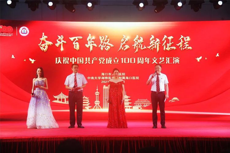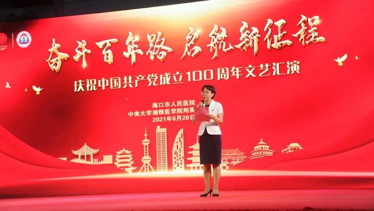 院党委书记王会庆同志向晚会致辞。她说:100年来,我们党团结带领全国人民前仆后继、顽强奋斗,把贫穷落后的旧中国改变成日益走向繁荣富强的新中国,久经磨难的中华民族迎来了从站起来、富起来到强起来的伟大飞跃,迎来了实现中华民族伟大复兴的光明前景,历史雄辩地证明了中国共产党的伟大、光荣与正确,没有共产党就没有新中国。她要求全体党员要铭记党的丰功伟绩,发扬党的光荣传统,传承党的红色基因,赓续共产党人的精神血脉,不忘初心、牢记使命,奋力谱写全面建设社会主义现代化国家的新篇章。她希望全院广大党员、干部职工坚持以习近平新时代中国特色社会主义思想为指导,增强“四个意识”、坚定“四个自信”、做到“两个维护”。弘扬“敬佑生命,救死扶伤,甘于奉献,大爱无疆”的职业精神,以党的百岁华诞为新起点,勇于担当作为,抢抓海南建设自由贸易港的机遇,为我院的发展做出新的贡献。