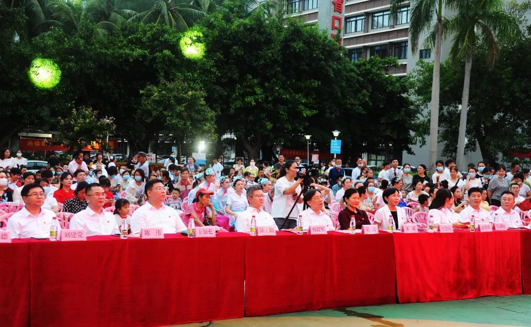 海口市市委办公室二级调研员、海口市党史学习教育领导小组第四巡回指导组组长朱斌,海口市卫健委副主任吴亮,老领导史克珊、符国珍,院党委书记王会庆,党委副书记、院长杨毅军及党政领导班子与现场500余名观众一起观看了演出。