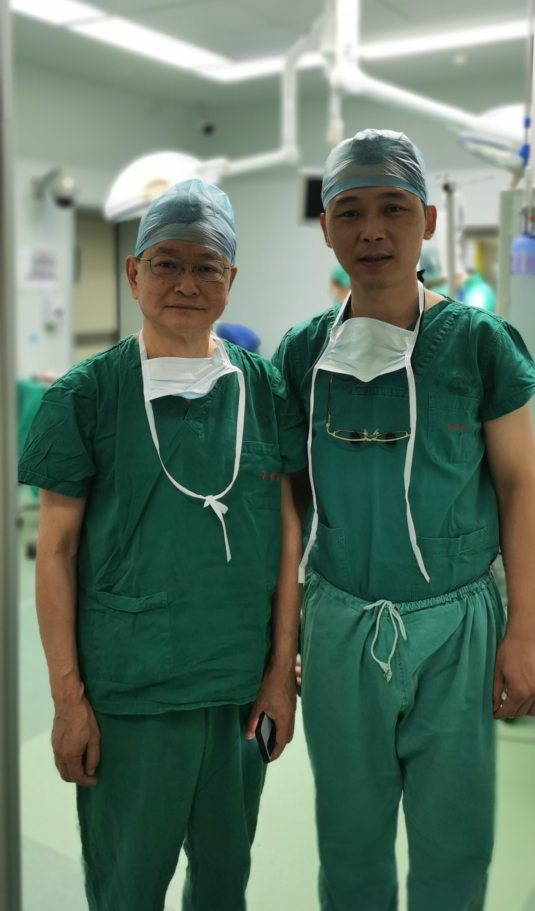 肖锋(左)与符洪犊(右)在手术结束后,摘下口罩合影