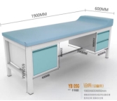 尺寸:长1900mm*宽600mm*高720mm(头)650mm(尾),误差±2mm,无洞,材质:钢制,医用皮革,双抽带储物柜,含一张可滑动带升降功能小座椅。 |