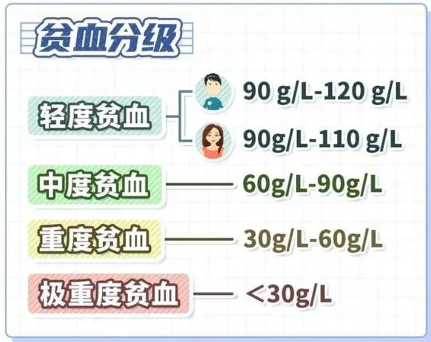我们依据血红蛋白的浓度将贫血分为轻度、中度、重度、极重度贫血四个等级的贫血程度。贫血程度不同,贫血的症状也不一样。轻度贫血多数对患者的生活影响不大,生活中亦可能不容易被发现,但重度或极重度贫血会影响人体代谢,严重时可在短时间内危及生命。